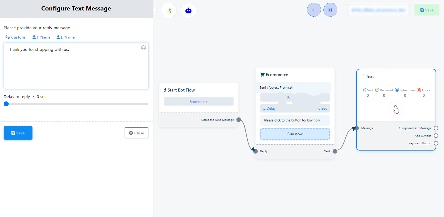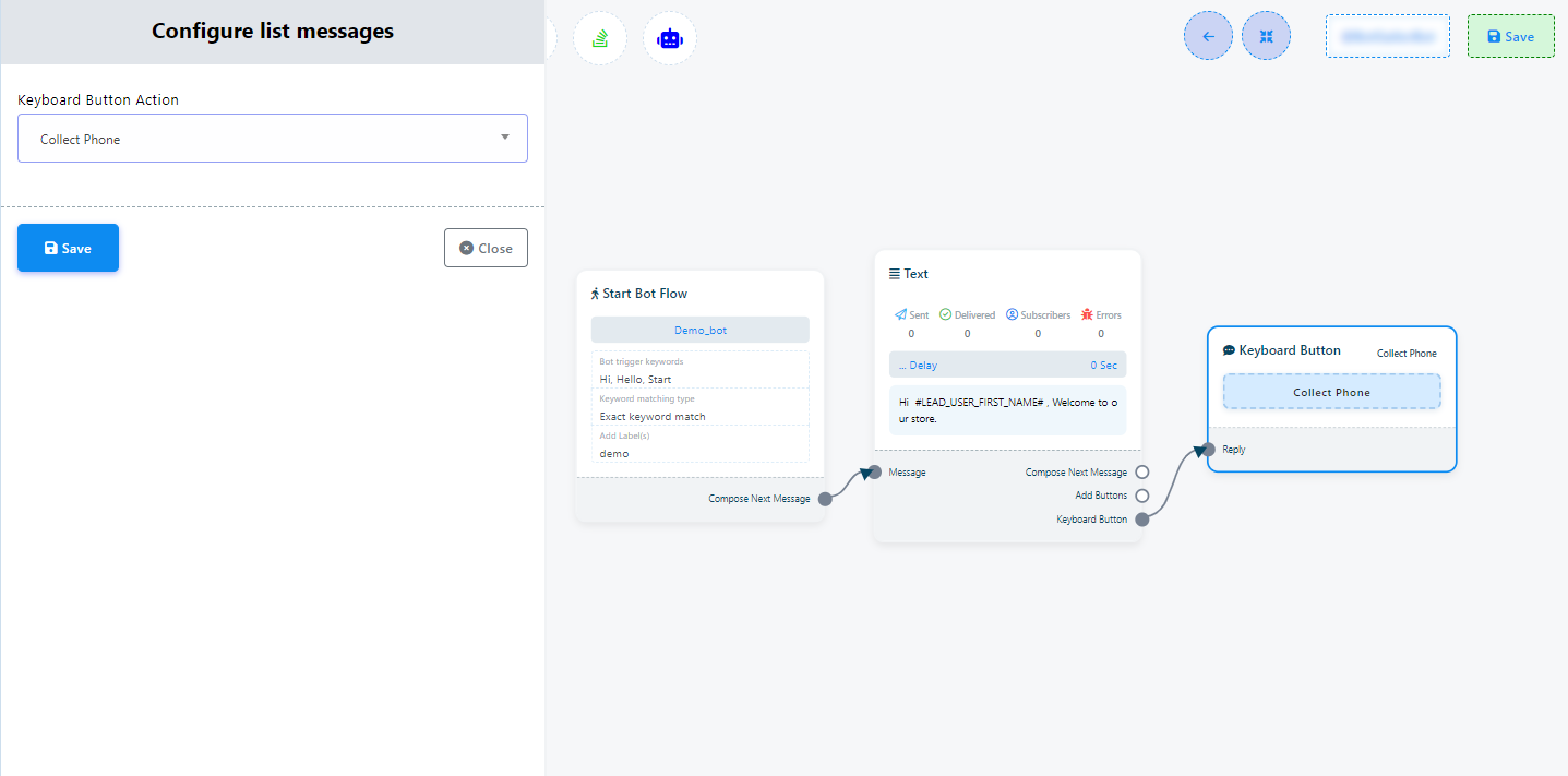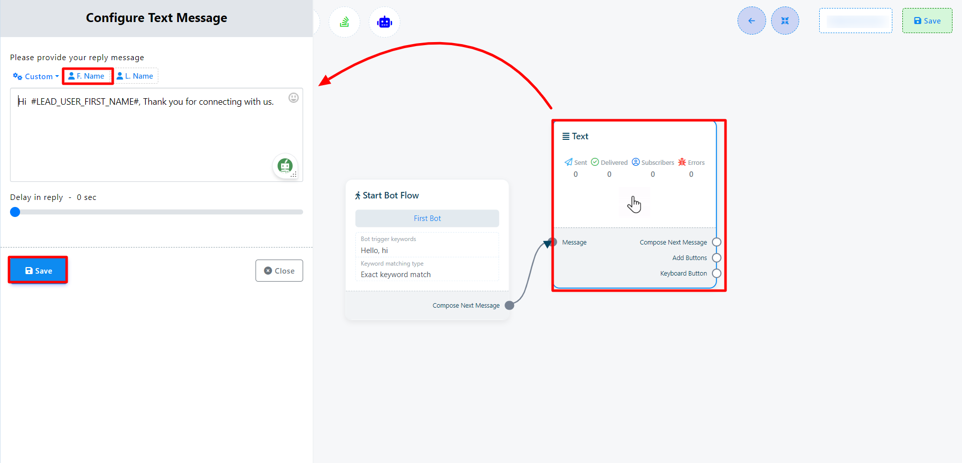 Acum dă click pe butonul Salvează și informațiile vor apărea pe componentă. Apoi conectează componenta text cu componenta Start bot flow.