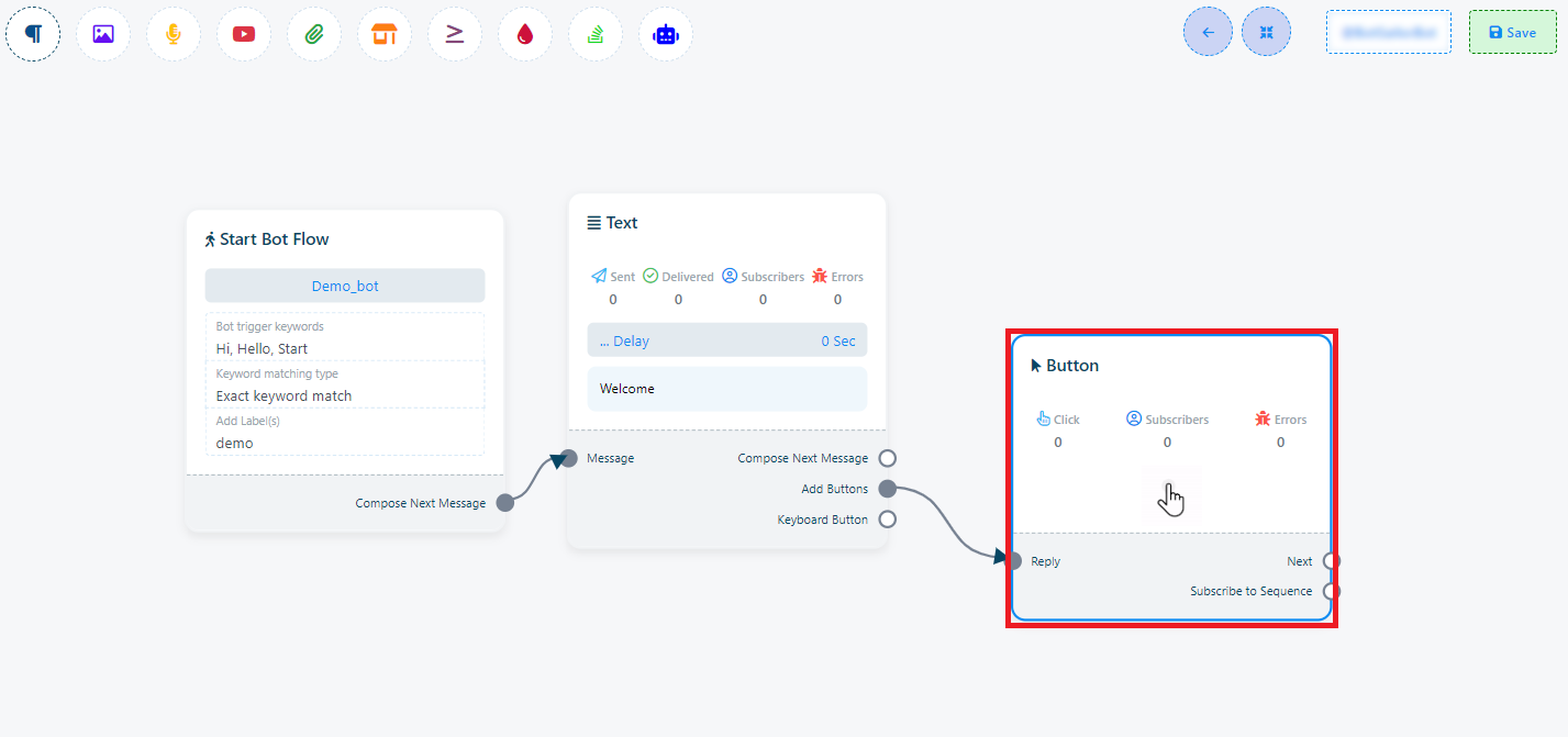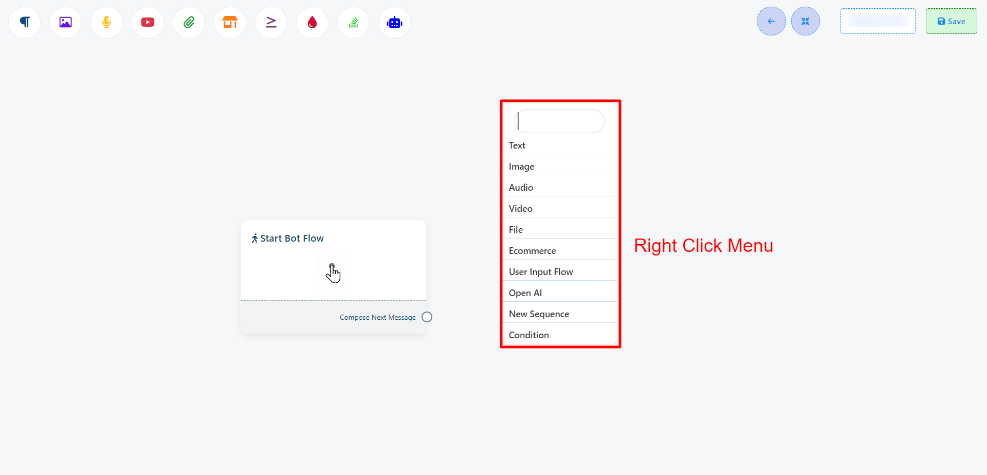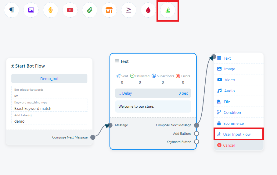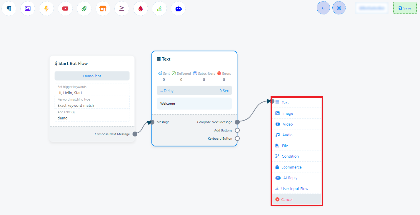 Odată ce ai finalizat configurarea Start Bot Flow, vei vedea un socket numit Compune Mesajul Următor. Aceste socket-uri îți permit să adaugi diverse componente de răspuns. După adăugarea componentelor, trebuie să le configurăm corespunzător.