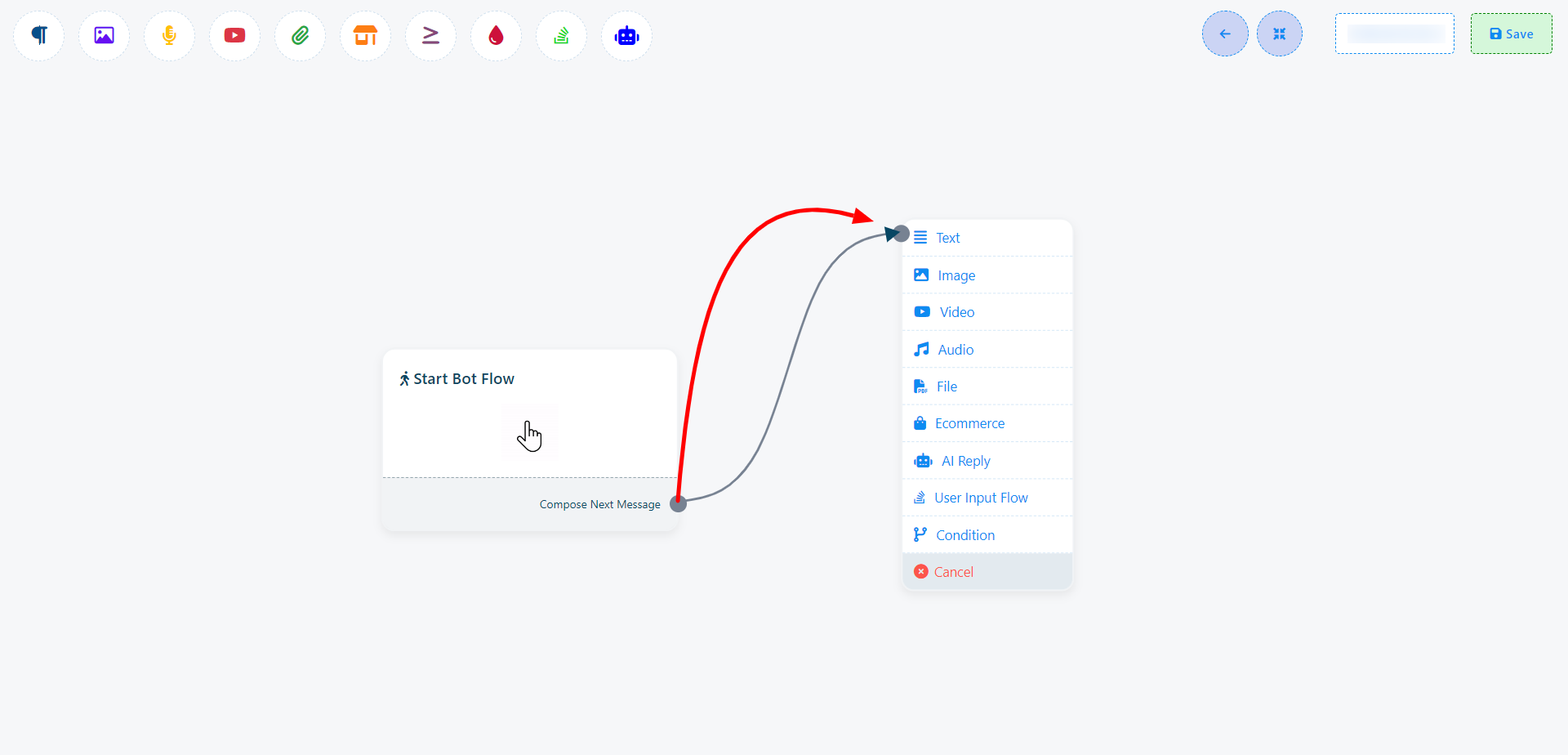De exemplu, să zicem că tragi din socket-ul de ieșire următor al componentei text. Aceasta va declanșa un meniu derulant care prezintă diferite componente precum Text, Imagine, Video, Audio, Fișier, Ecommerce, Flux de Input Utilizator și un buton Anulare. Din acest meniu derulant, poți alege componenta dorită. Dacă dorești să anulezi și să nu adaugi o componentă, pur și simplu dă click pe butonul Anulare.
