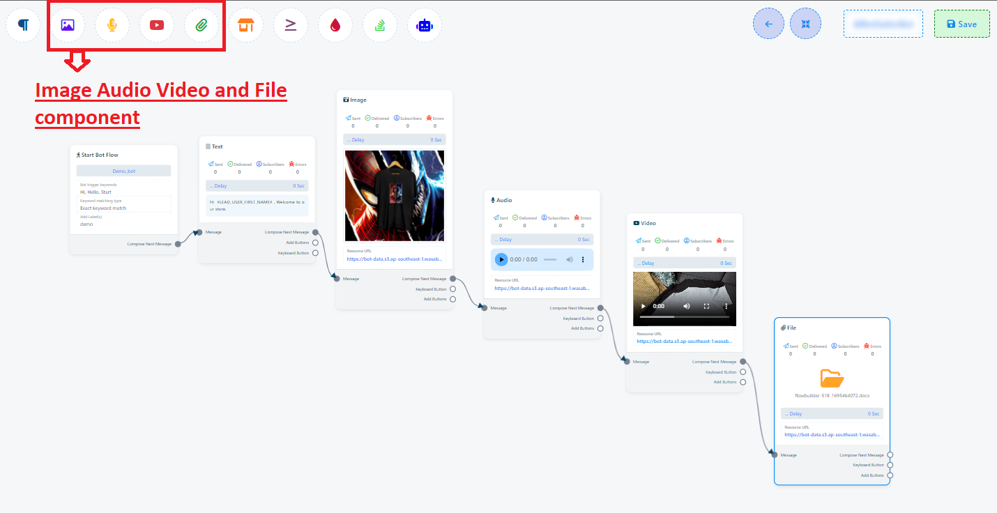 Similar, ai opțiunea de a incorpora componente imagine, audio, video și fișier în chatbot-ul tău. Pentru a folosi aceste componente, va trebui să încarci imaginea, audio-ul, video-ul sau fișierul corespunzător. După aceea, poți stabili conexiuni între aceste componente și alte elemente după necesități.