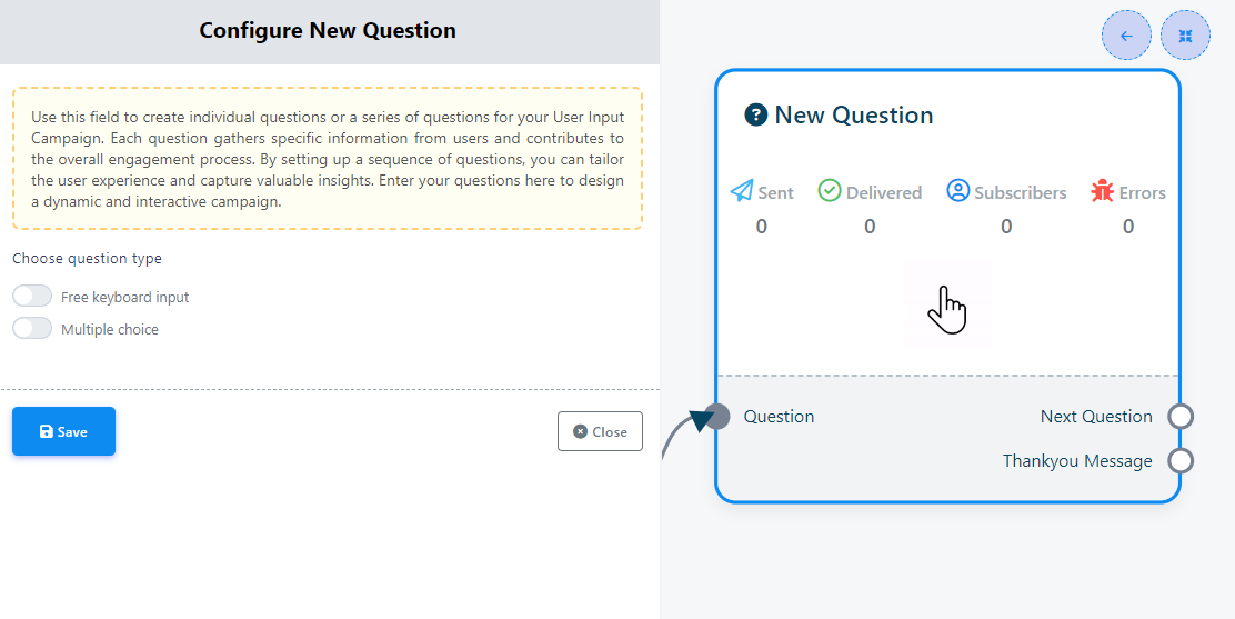 - Dă dublu click pe componenta Întrebare Nouă pentru a accesa două butoane: Input Liber Tastatură și Alegere multiplă. Aceste butoane determină tipul de întrebări pe care vrei să le pui.