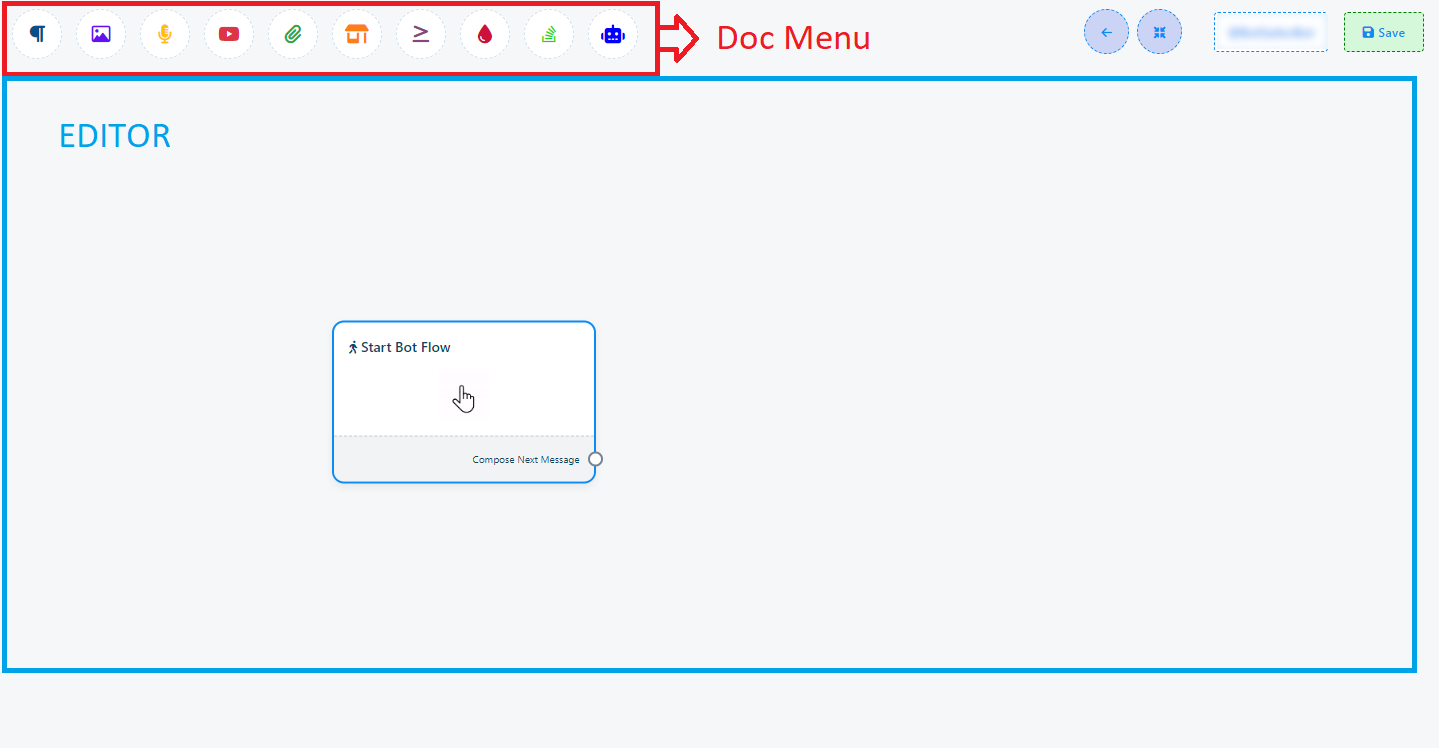 Odată ce ai deschis Flow Builder, vei descoperi că toate componentele sunt convenabil consolidate în colțul din stânga sus al ecranului în Meniul Superior. Simultan, în secțiunea Editor, vei observa că componenta Start Bot Flow este deja preîncărcată pentru conveniența ta.