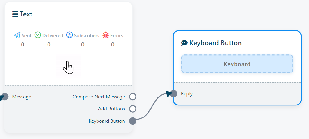 - Pentru a include această componentă, pur și simplu trage cursorul din socket-ul buton tastatură al componentelor Text, Imagine, Audio, Video sau Fișier și eliberează-l în editor. Această acțiune va introduce imediat o componentă Tastatură conectată la componenta părinte.