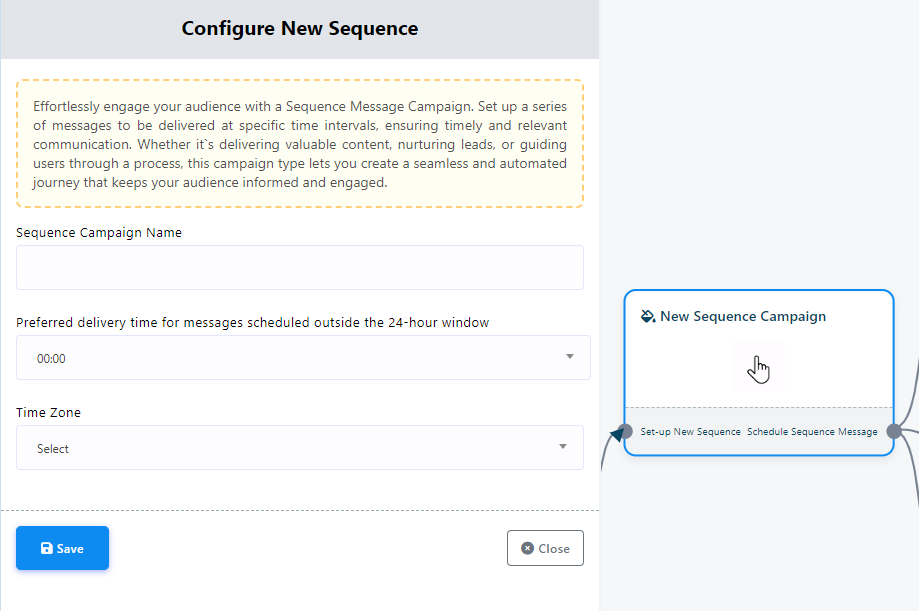 - Dă dublu click pe Campanii Secvență Noi. În acest pas, specifică un nume pentru Campania ta Secvență completând câmpul Nume Campanie Secvență.
