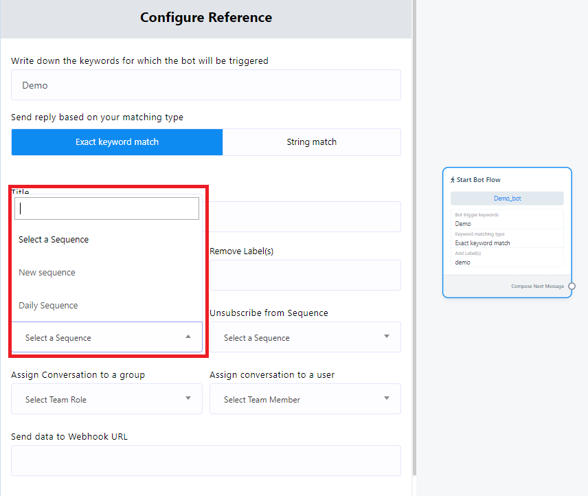 - Declanșare Cuvânt Cheie: Pentru a iniția botul folosind cuvinte cheie specifice, dă dublu click pe elementul Start Bot Flow. Această acțiune va deschide bara laterală stângă Configurare Referință, cu zece câmpuri și două butoane. În câmpul cuvânt cheie, adaugă cuvinte cheie și separă-le prin virgule când adaugi mai mult de un cuvânt cheie. Când un utilizator introduce text în fereastra de mesagerie care se potrivește cu oricare dintre aceste cuvinte cheie, botul va fi activat.