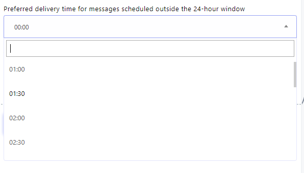 - Pentru a determina momentul livrării mesajelor din serie, folosește câmpul Ora preferată de livrare pentru mesajele programate în afara ferestrei de 24 de ore. Poți alege din ore prestabilite sau introduce manual ora de livrare preferată.
