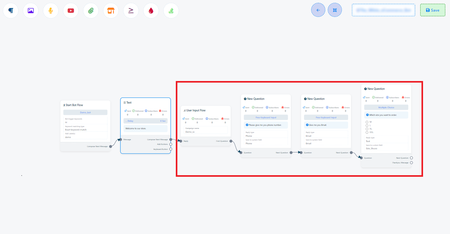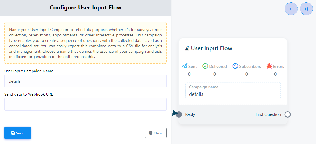 Odată ce campania ta Flux de Input Utilizator este în funcțiune, o poți integra perfect în fluxul botului tău. Când un utilizator întâlnește componenta Flux de Input Utilizator în fluxul botului tău, i se vor pune întrebările definite în campania ta. Răspunsurile lor vor fi înregistrate automat în câmpurile personalizate specificate.