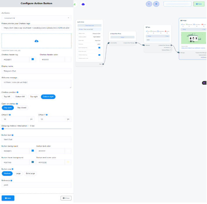 - Acum să adăugăm răspunsul dorit din socket-ul Start Bot Flow pentru Widget-ul de Chat. Putem folosi orice fel de răspunsuri precum Text, imagine, audio, video sau orice dorim. Apoi salvează fluxul bot.