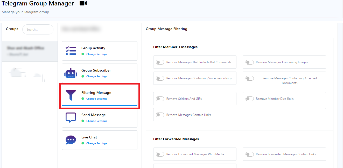Această secțiune joacă un rol esențial în gestionarea grupului, ajutând la organizarea membrilor și facilitând filtrarea mesajelor în cadrul grupului tău. Ai capacitatea de a filtra mesajele de la membrii grupului folosind opțiuni precum Filtrare Mesaje Membri, Filtrare Mesaje Redirecționate, Supraveghere Cuvinte Cheie, Mesaje Filtrate Admin, Mesaje Serviciu, Restricții Membri Noi și Limite Mesaje Membri.