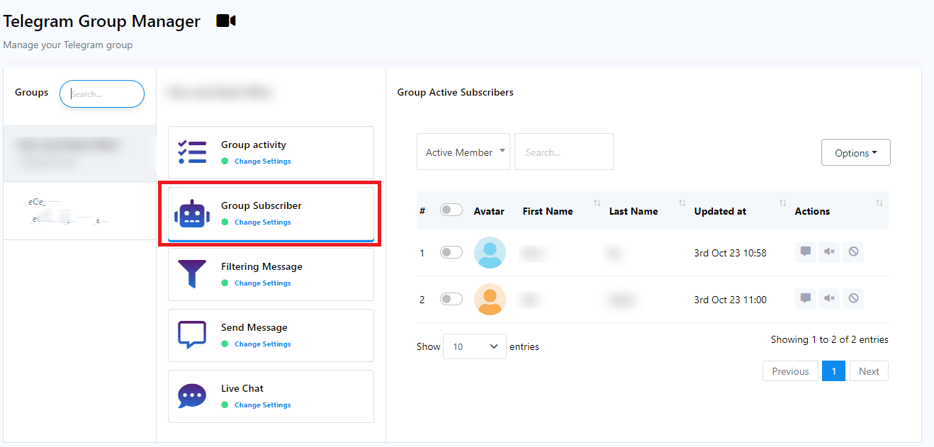 Abonați Activi Grup: În secțiunea Abonați Activi Grup, vei găsi o listă completă conținând detalii despre toți membrii angajați activ în grup. Această listă oferă informații valoroase despre membrii grupului tău.