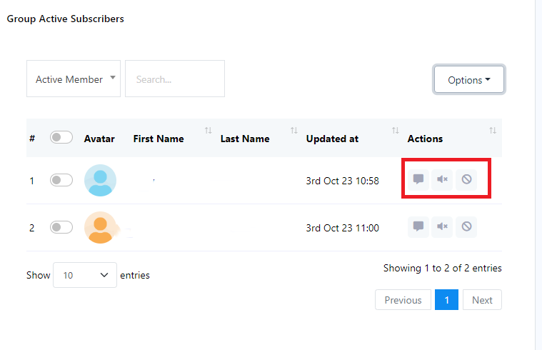 Amuțește Abonat: Pentru a împiedica un abonat să trimită mesaje în grup temporar, efectuează următoarea acțiune: Dă click pe butonul Amuțește Abonat. Această acțiune va ajuta la menținerea unui mediu de grup mai liniștit prin amuțirea abonatului pentru o durată specificată.