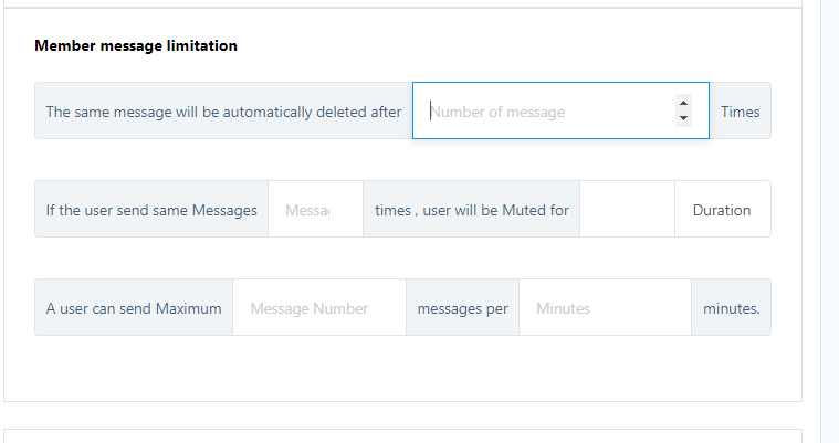 Limitare mesaje membri: Această funcție îți permite să configurezi ștergerea automată a mesajelor repetitive după un număr specificat de utilizări. În plus, poți configura o funcție de amuțire automată pentru utilizatorii care trimit excesiv același mesaj, cu capacitatea de a defini durata acestei amuțiri.