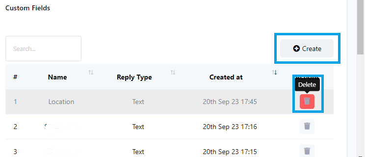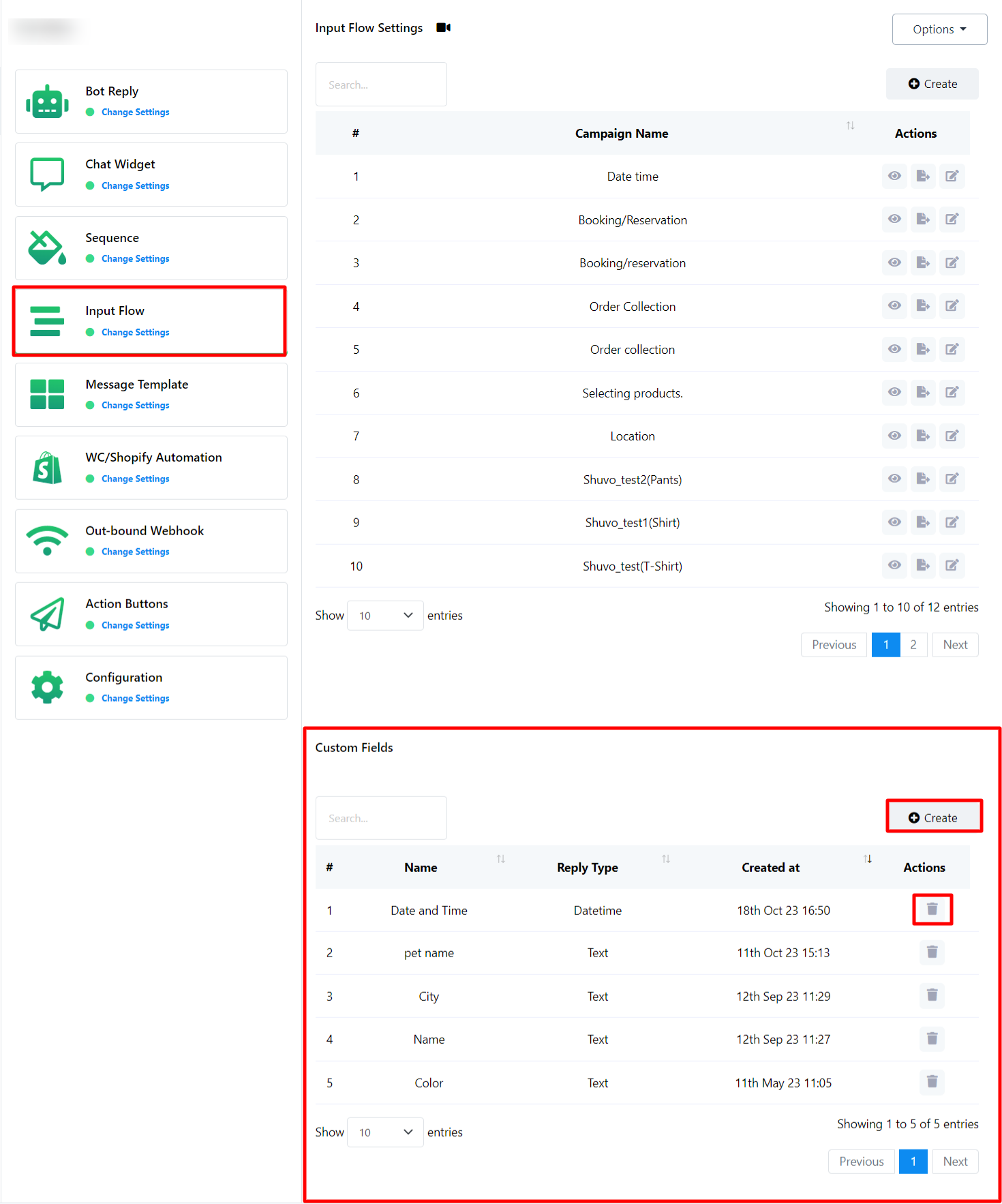 - Dă click pe Creează în secțiunea Câmpuri Personalizate pentru a crea un nou câmp personalizat pentru utilizare în Fluxuri de Input Utilizator.