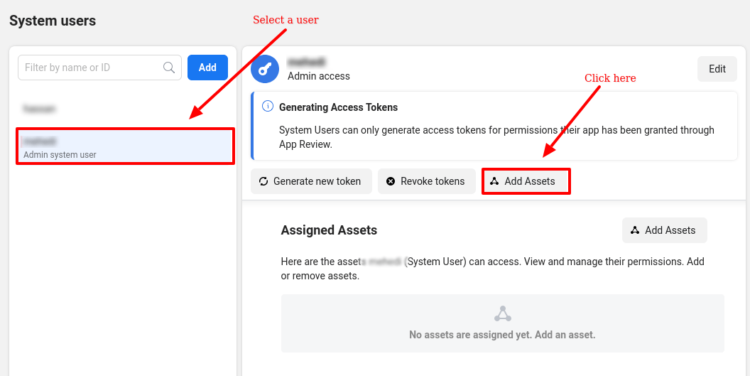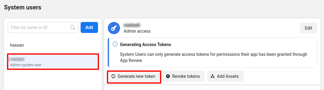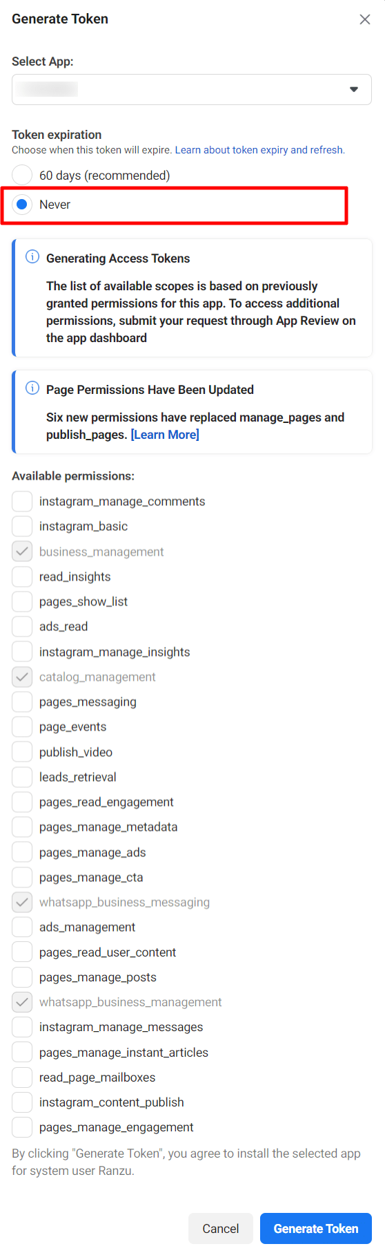 Apoi va apărea o listă de permisiuni disponibile. Din listă, trebuie să selectezi Gestionare business, Gestionare catalog, Mesagerie WhatsApp business și Gestionare WhatsApp business. Acum dă click pe butonul Generează token.