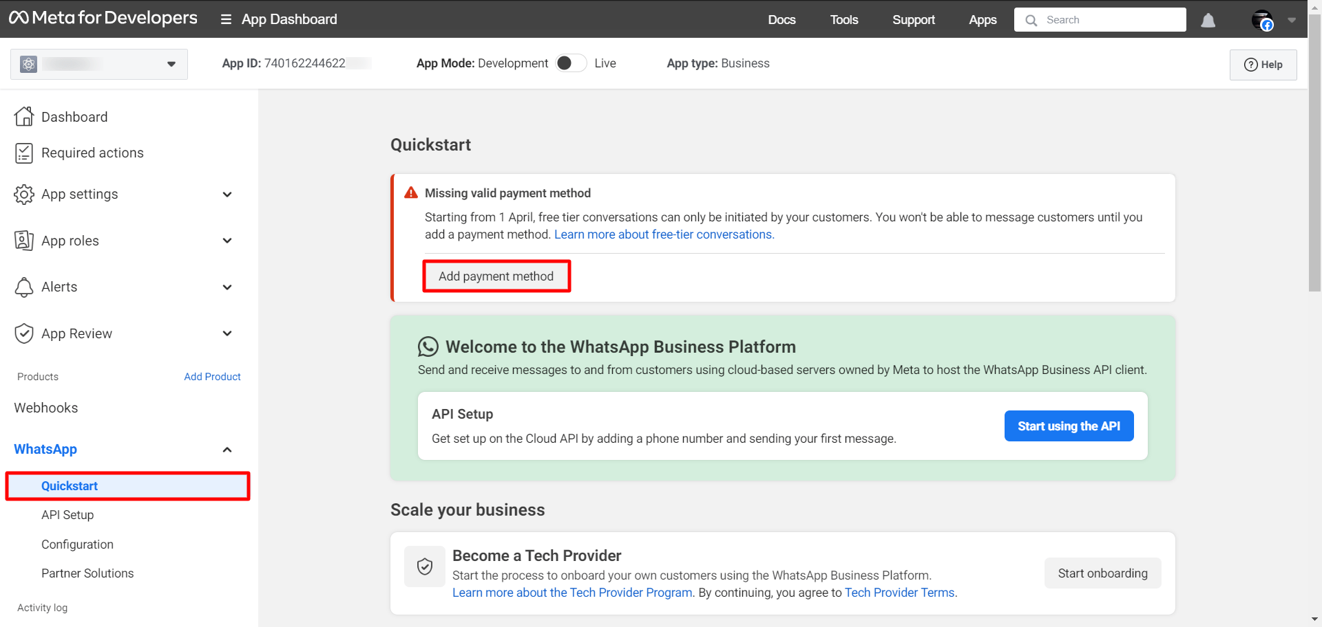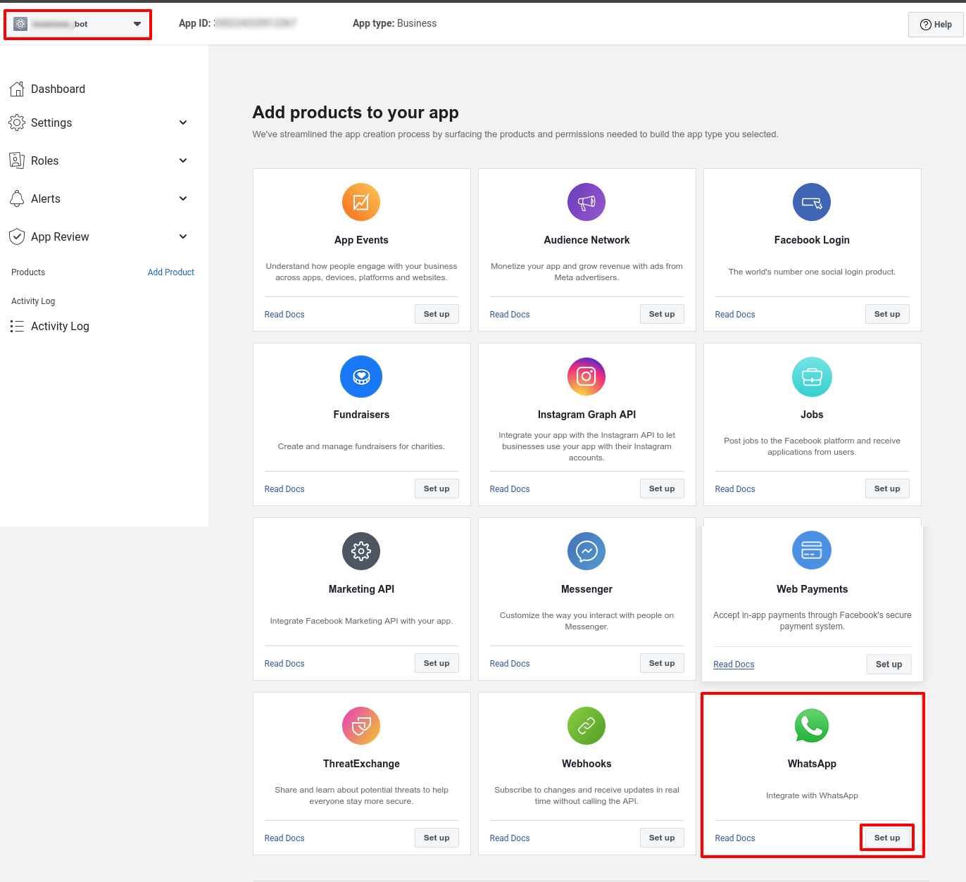 Deoarece vei crea o aplicație pentru un cont WhatsApp business, trebuie să adaugi WhatsApp la aplicație.