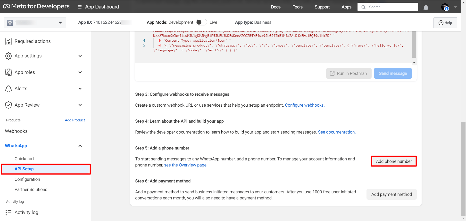 Apoi mergi la Configurare API din meniul din stânga și dă click pe butonul "Adaugă număr de telefon" pentru a adăuga numărul de telefon pentru WhatsApp Cloud API.