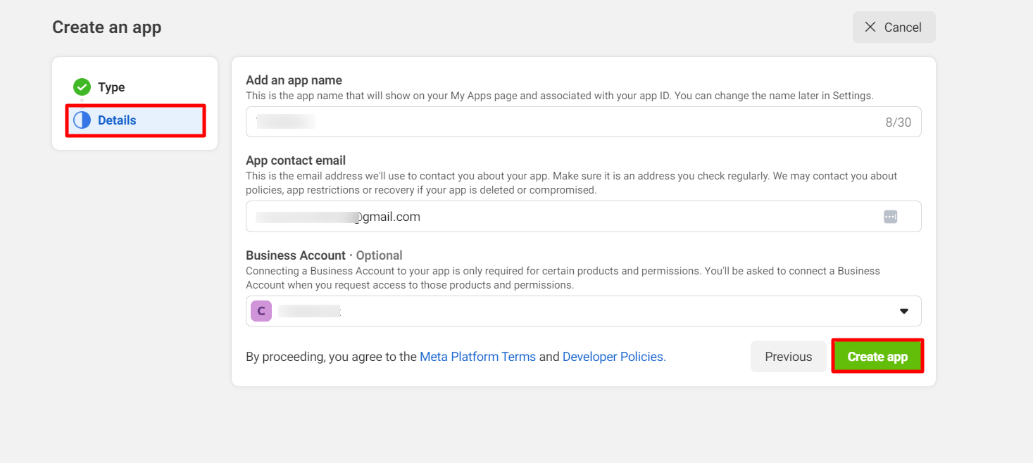 În câmpul Nume afișat, adaugă un nume afișat pentru contul tău de business. În câmpul Email Contact Aplicație, furnizează o adresă de Email.