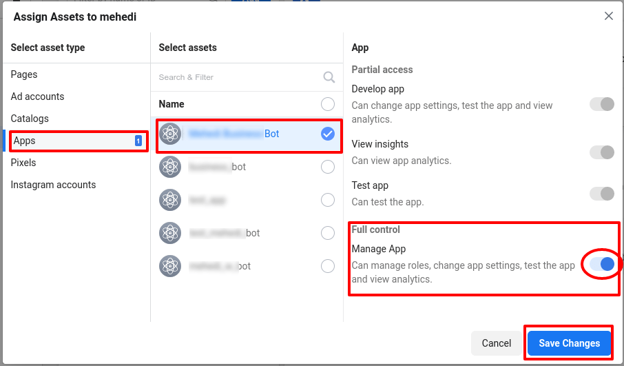 Instantaneu, va apărea un modal. Din secțiunea Selectează tipul de activ a modalului, selectează meniul Aplicații. Acum selectează aplicația căreia vrei să îi atribui active. Apoi acordă permisiune. Aici acord permisiunea Control complet activând butonul radio al opțiunii Control complet. Acum dă click pe butonul Salvează modificările.
