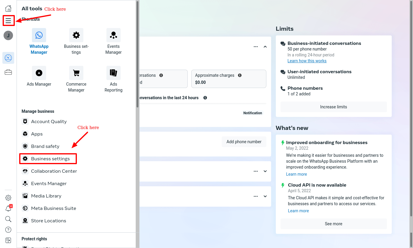 Pe pagina de prezentare generală, dă click pe butonul meniu și bara laterală stângă va fi extinsă cu toate instrumentele. Acum dă click pe Setări Business.