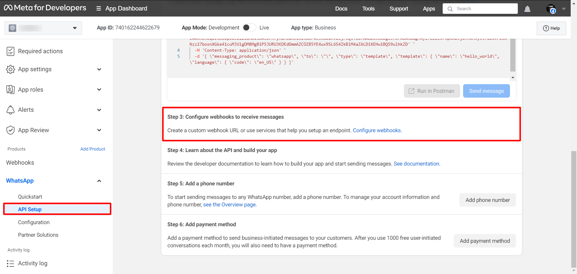 Acum, trebuie să configurezi webhook-ul pentru a primi mesaje. Pentru a configura webhook-urile, mergi la pasul 3 din configurarea API și dă click pe link-ul Configurează webhook-uri.