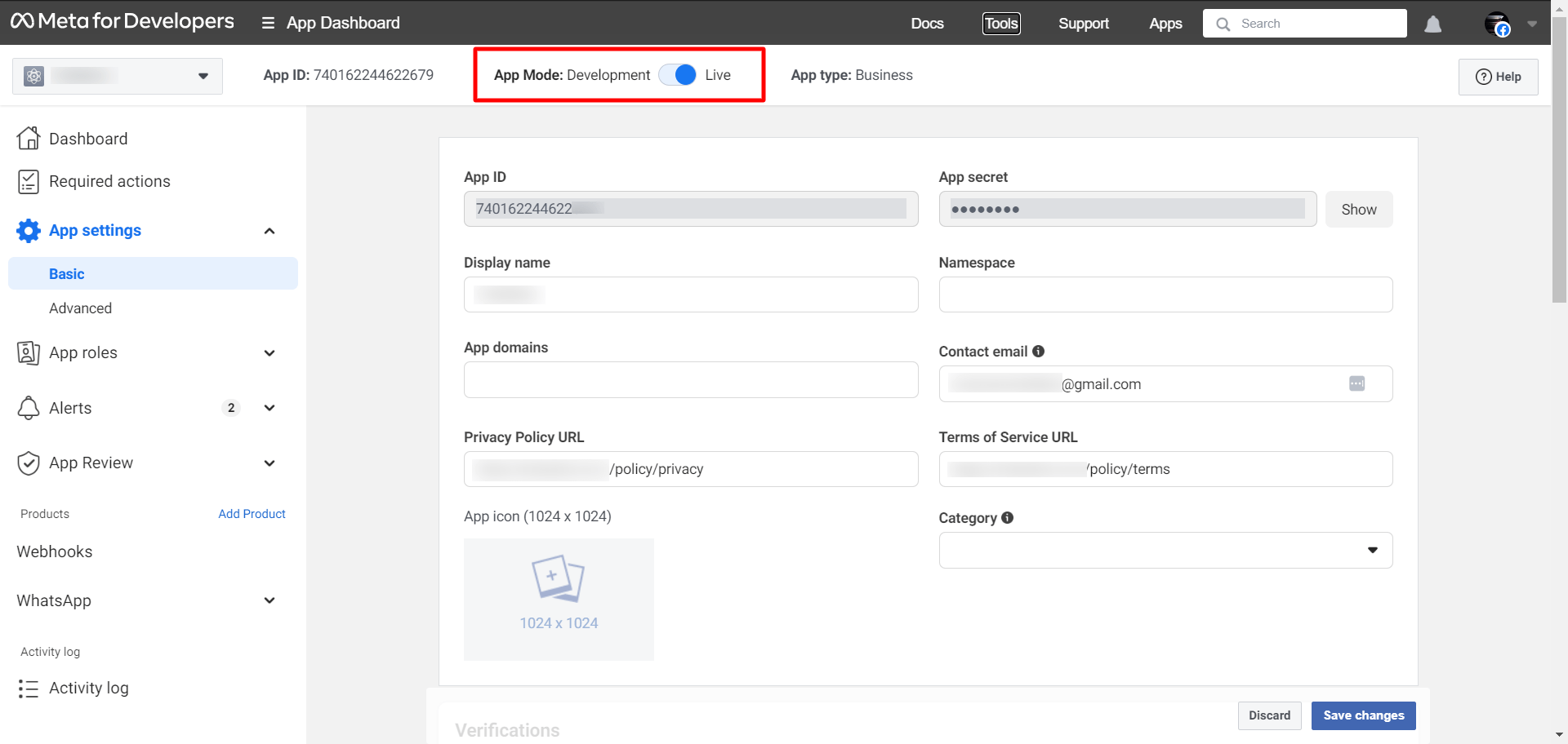 După adăugarea URL-urilor pentru confidențialitate și termeni și condiții, pur și simplu activează modul live din modul dezvoltator. Pentru a face asta, dă click pe butonul toggle așa cum este arătat mai jos.