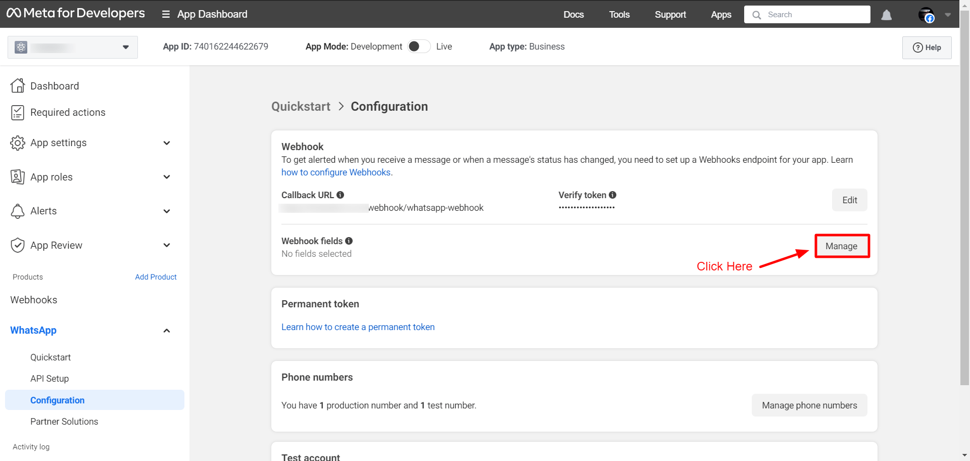 Acum trebuie să selectezi câmpurile webhook. Pentru a selecta câmpurile webhook, dă click pe butonul Gestionează.