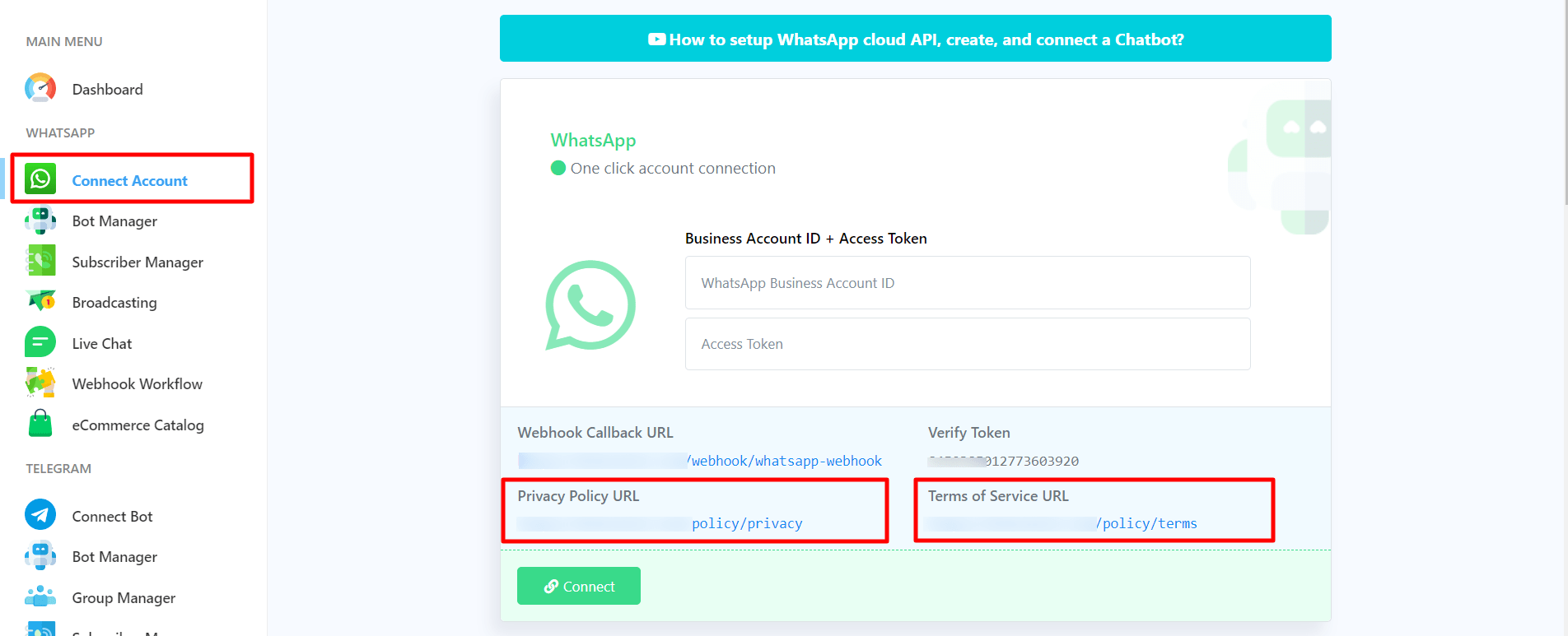 După introducerea ID-ului contului WhatsApp business și a token-ului de acces, dă click pe butonul Conectează.