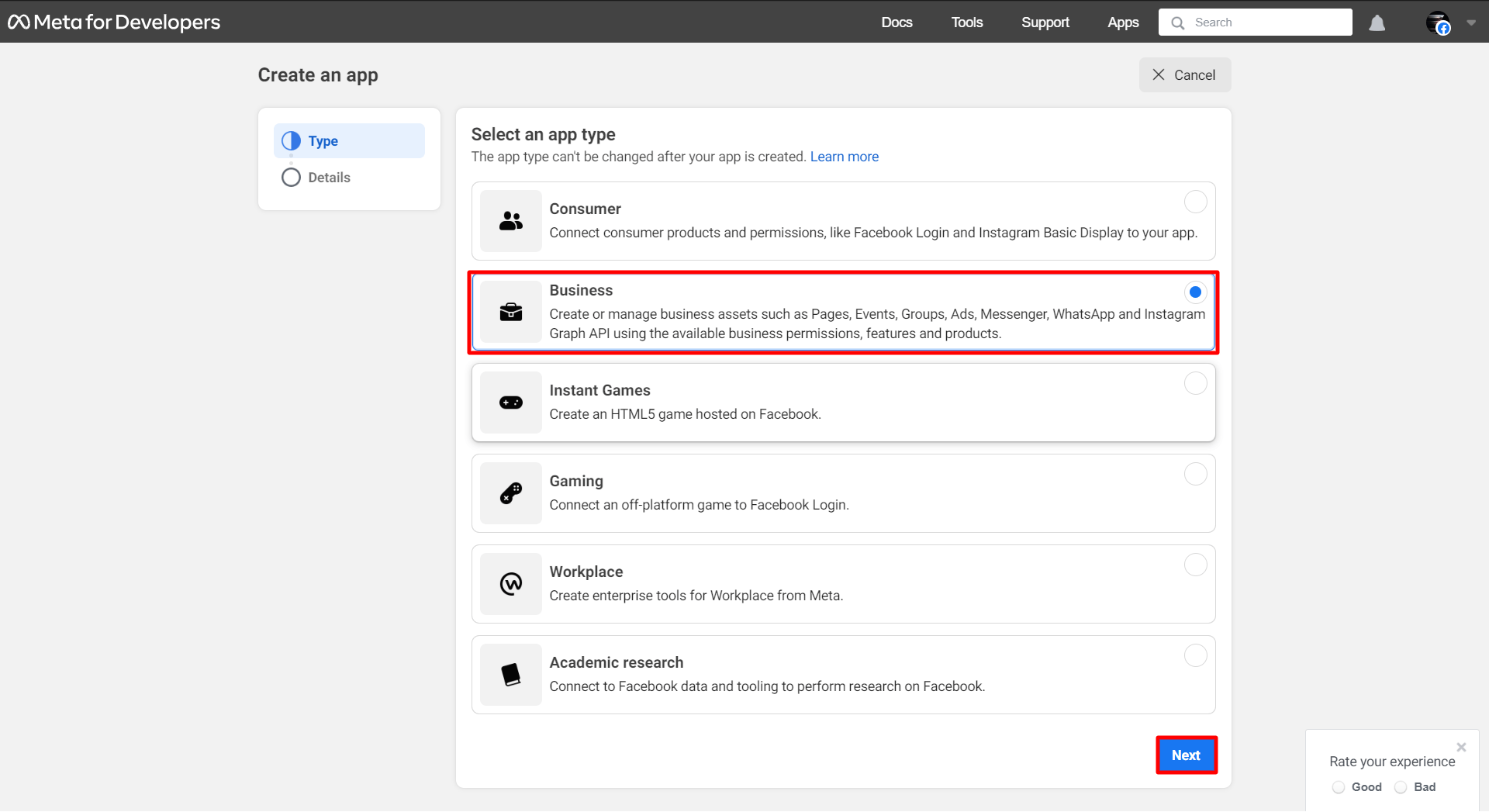 Instantaneu, va apărea o pagină numită Creează o Aplicație cu o listă de tipuri de aplicații. Și din lista de tipuri de aplicații, trebuie să selectezi un tip. Selectează Business ca tipul tău de aplicație. Apoi dă click pe butonul următor.