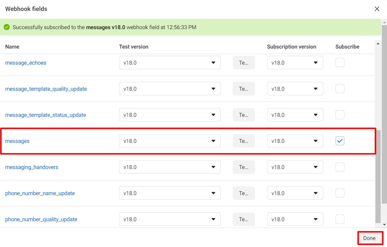 Instantaneu, va apărea un modal pop-up cu câteva câmpuri webhook. Acum abonează-te la câmpul webhook Mesaj. Acum dă click pe butonul Terminat.