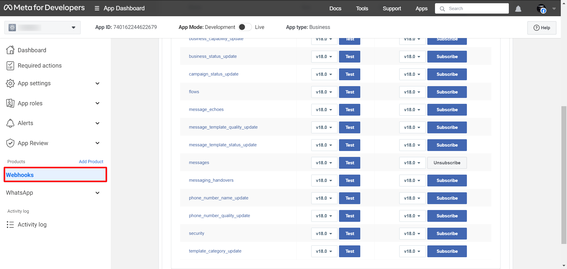 Te poți abona și dezabona și de la webhook-uri pe pagina de webhook-uri. Dă click pe meniul webhook-uri și va apărea pagina webhook cu câteva câmpuri webhook. Pe pagină, te poți abona și dezabona de la orice câmp webhook.