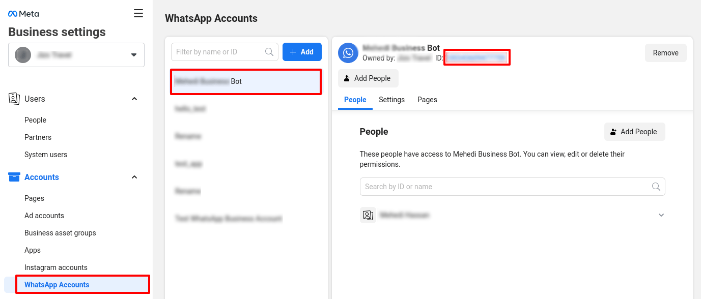 Pentru a obține ID-ul Contului WhatsApp Business, mergi la pagina de setări Business. Apoi în bara laterală stângă a paginii, selectează meniul Cont WhatsApp. Instantaneu, va apărea secțiunea Conturi WhatsApp. Acum selectează aplicația ta și copiază ID-ul Contului WhatsApp Business.