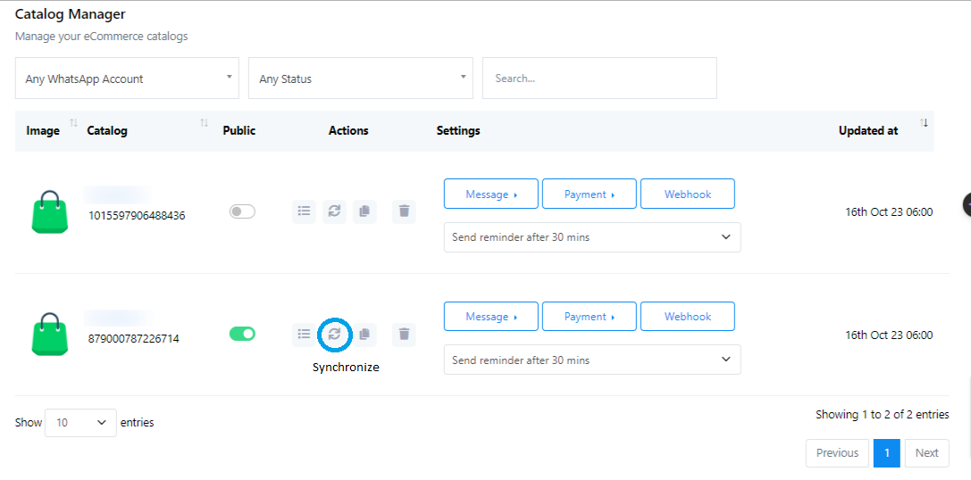 - Sub Acțiuni, poți vizualiza produsele catalogului. Sincronizează orice produse adăugate sau actualizate.