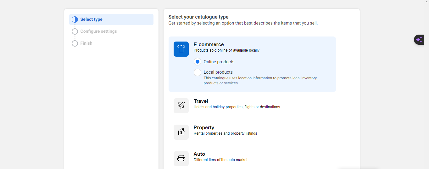 - Selectează Online sau Produse Locale în funcție de tipul afacerii tale, apoi dă click pe Următorul.
