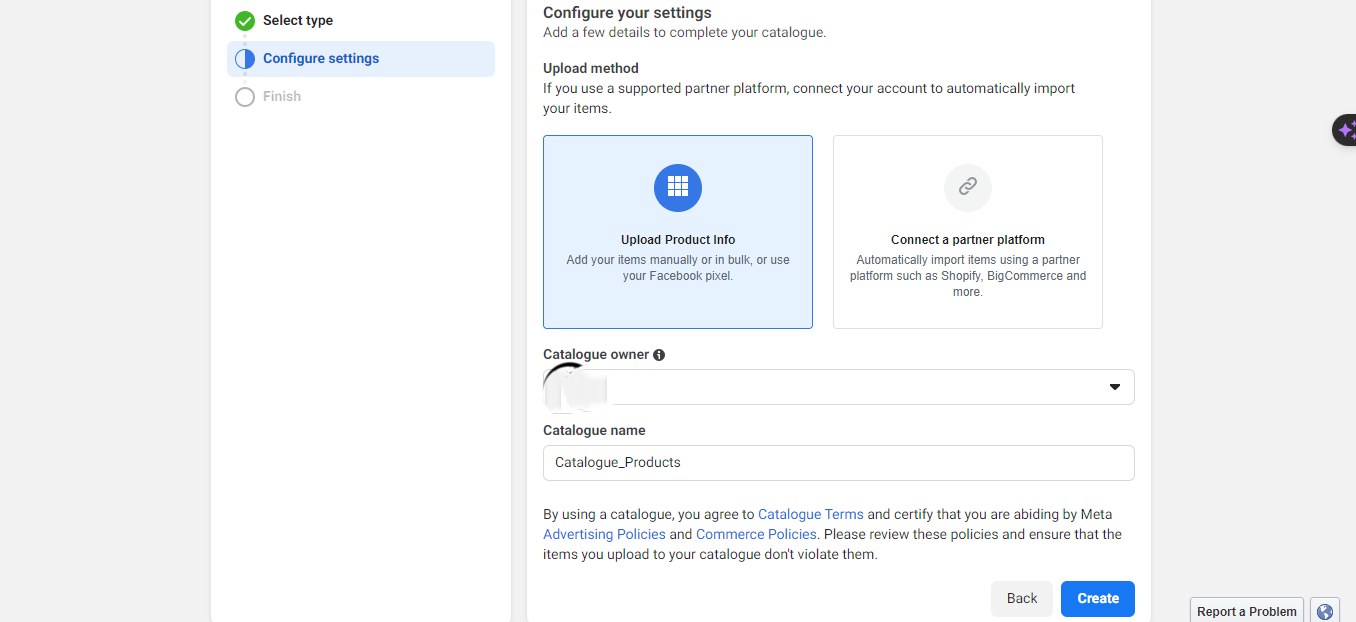 - În secțiunea proprietar catalog, selectează afacerea ta dacă ai mai multe afaceri.